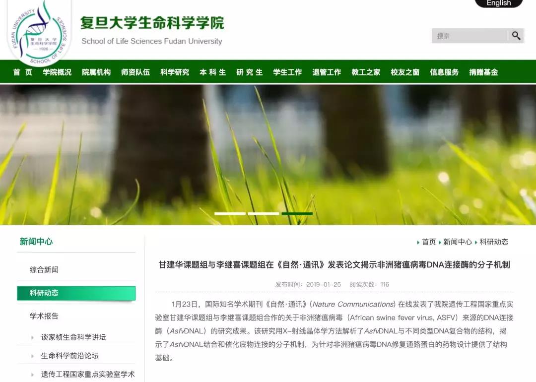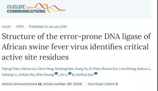 2019年1月23日,國際知名學術期刊《自然·通訊》(Nature Communications) 在線發表了復旦大學及四川大學關于非洲豬瘟病毒(African swine fever virus, ASFV)來源的DNA連接酶(AsfvDNAL)的研究成果。