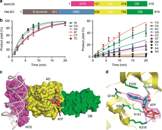 AsfvLIG包含四個獨特的殘基,包括AD域的Asn 153和Leu 211,以及OB結構域的Leu 402和Gln 403。雖然他們不參與直接催化過程,這些殘基可能與其相應的NTD或DBD結構域協同工作,這些位點殘基對缺口的識別和催化效率有著重要的意義。